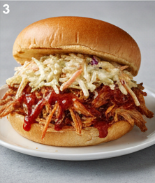 Slow-cooked pork shoulder, shredded and smothered in barbecue sauce, typically served on a soft bun.