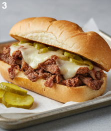 A sandwich originating from Philadelphia, made with thinly sliced beefsteak and melted cheese.