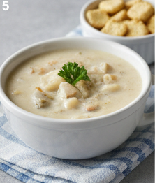 A rich and creamy soup made with clams, potatoes, onions, and celery.
